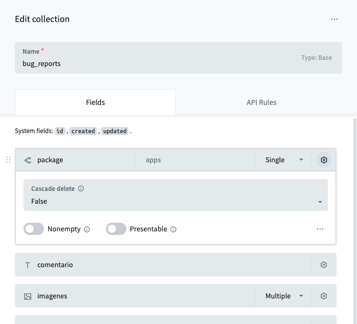 Como se observa en la imagen, un campo crucial es package, el cual establece una relación simple con la colección apps que creamos anteriormente. Al seleccionar el id de una aplicación específica en este campo, vincularemos el reporte de bug a la aplicación correspondiente.